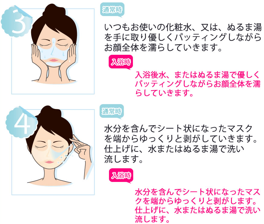 - シート状になったマスクを端からゆっくりとはがし、水かぬるま湯で洗いながして完了です。